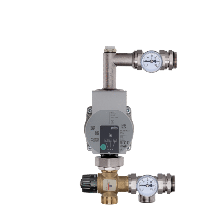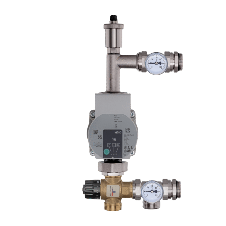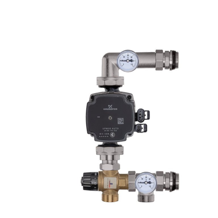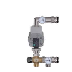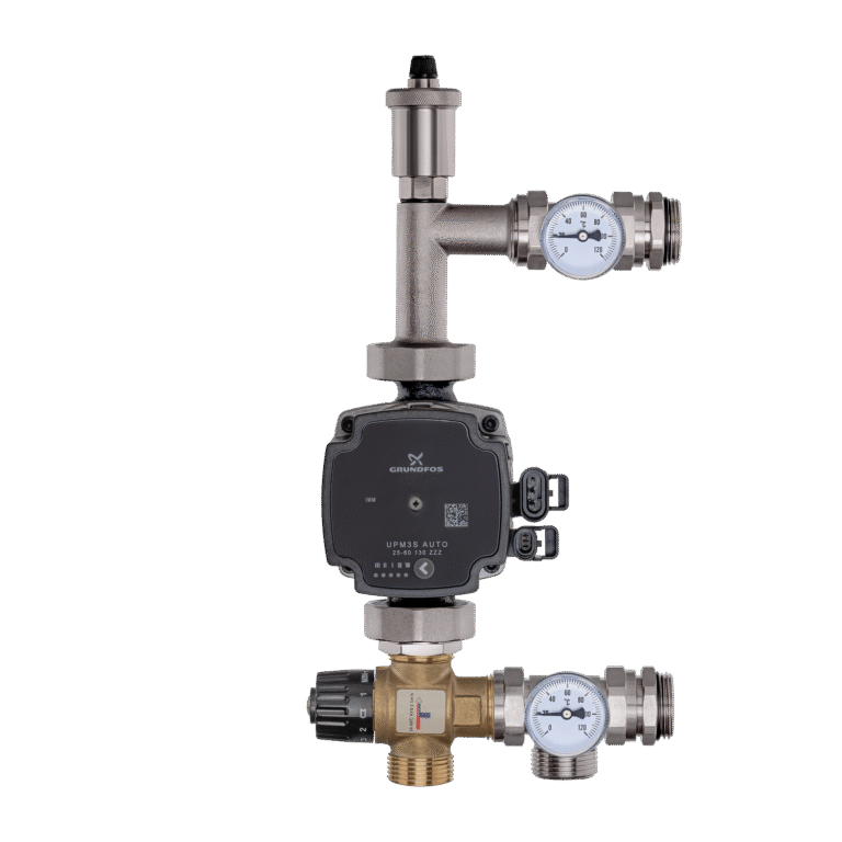 Mosazné směšovací soupravy (směšovací skupiny) se skládají z oběhového čerpadla, trojcestného ventilu (bimetalového), teploměrů a odvzdušňovacího ventilu.